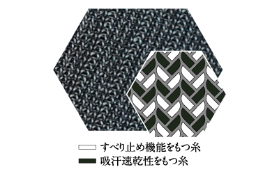 上端部にすべり止め機能をもつ「糸」を編み込み、使用中のずり落ちを防止。