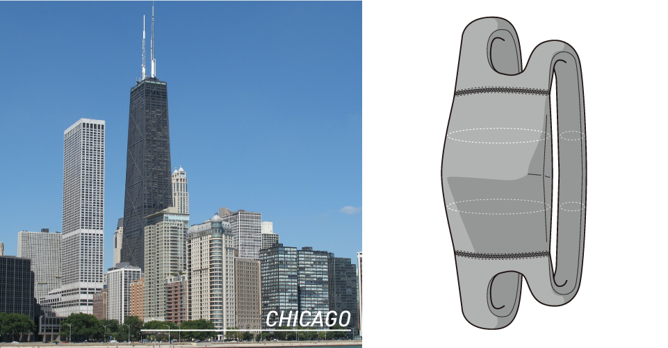 20世紀後半の米国シカゴ、ニューヨークの超高層ビル建築を可能にした建築工法の一つ。しなやかさと強度を支えるこの構造にデザインのヒントを得て、マスク全体をチューブ状にデザイン。
