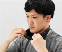 ①マスク全体を一旦首まで下げ、軽く広げて引き上げながら顔・頭から外す。