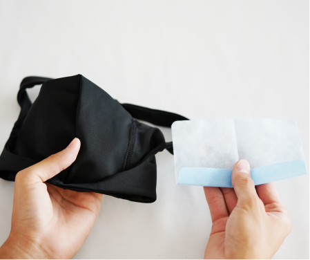 マスク本体のサイズに応じて、下記の方法でフィルターの大きさ調整をし、ポケット部に挿入してください。