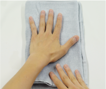 マスクをねじらず、握るように水分をとる。さらに乾いた清潔なタオルで挟み、押し当てて水気をとる(タオルドライ)。
