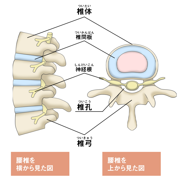 腰部を含む背骨(脊柱)を構成する骨を椎骨と呼び、頸部にある椎骨を頸椎、胸部にある椎骨を腰椎、腰部にある椎骨を腰椎と呼びます。