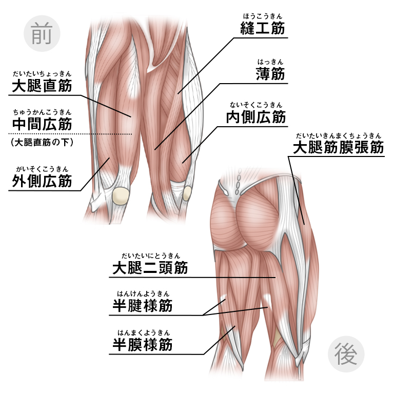 主となる筋は大腿四頭筋群:外側広筋、中間広筋、内側広筋、大腿直筋で、膝蓋腱を通じて脛骨に付着します。