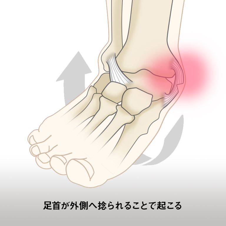 足首が強制的に外側へ曲げられること(外反)で、内側の靭帯が伸びる/損傷してしまいます。足首をひねる原因は様々な要因があります。