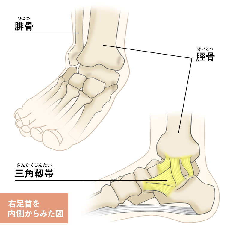 三角靭帯は体重を支える脛骨に付着していることから、荷重すると痛みが増すことから歩行困難がみられます。