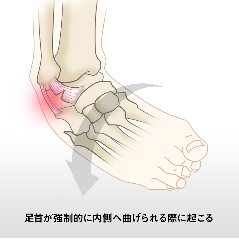 内反捻挫は足首を捻ることでそれらの靭帯の一つもしくはそれ以上を伸ばすあるいは断裂し、痛み、腫れ、歩行困難を引き起こします。