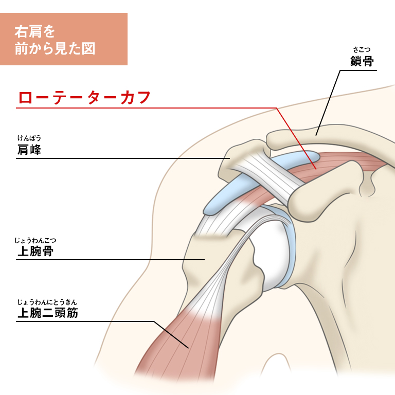 ローテーターカフ(インナーマッスル)は複数の筋肉/腱の集まりで上腕骨と肩を繋げています。ローテーターカフには棘上筋、棘下筋、小円筋、肩甲下筋が含まれ、これらの筋肉は、腕を上げる・旋回させることを補助します。ローテーターカフは肩峰の下を通っており、このローテーターカフが肩峰に対して引っかかる状態や擦れている状態をインピンジメントと呼びます。