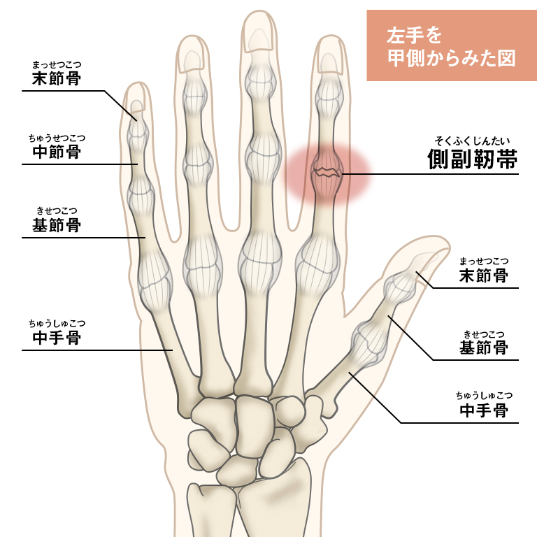 それぞれの指には3個の骨(指骨)があり、二つの関節を形成しています。親指は他の4本の指とは違い2個の指骨で、一つの関節だけです。それぞれの関節の両側には側副靭帯があり関節の安定させています。スポーツで一般的に捻挫されるのはこの側副靭帯です。