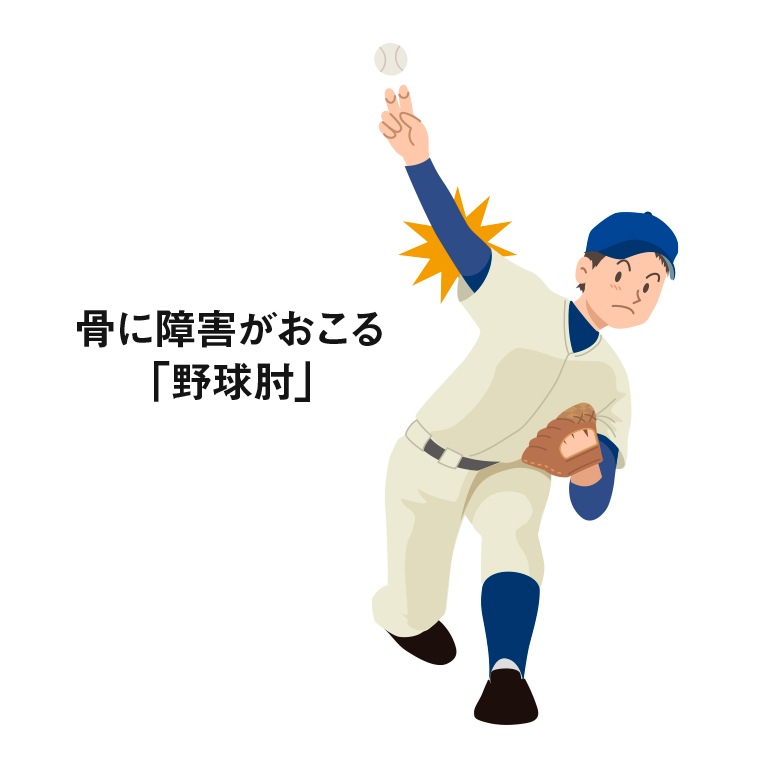 成長期の子供の骨は、特にそれぞれの骨の端の部分は、成長が終わった骨の中心部分よりも強度が弱い成長軟骨でできています。この成長軟骨が徐々に伸び・固くなり骨を形成することで体が大きくなっていきますが、奇しくも上腕骨内側上顆は骨の端にあたり、筋肉・腱・靭帯が集約されています。そのため、投球するたびに骨にストレスがかかるのは必然となります。