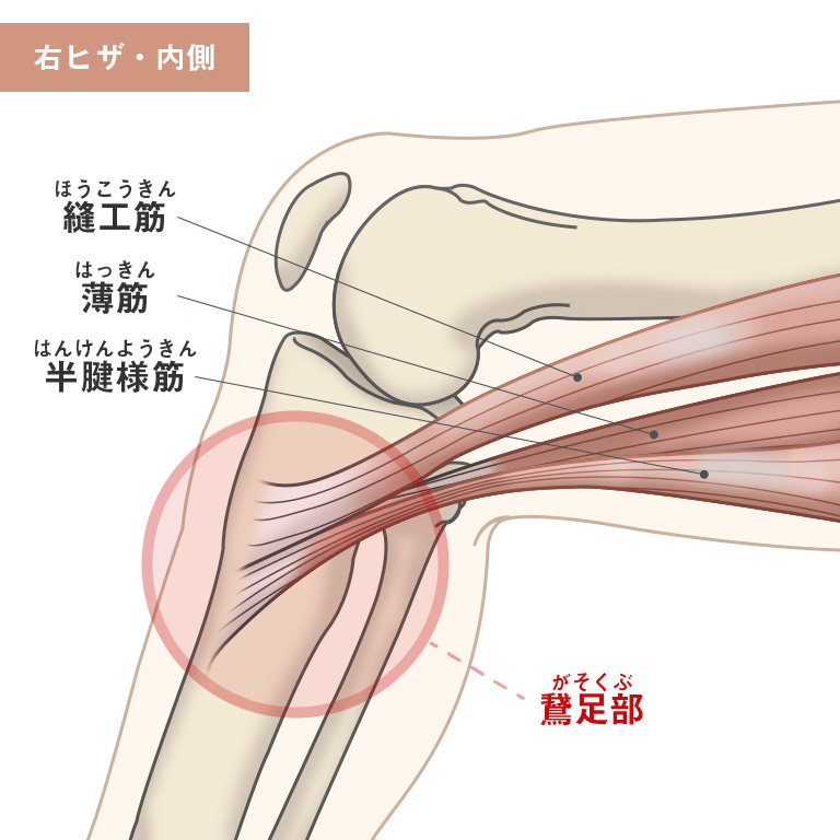 鵞足炎とはヒザの内側下方にある鵞足(がそく)と呼ばれる部位に炎症が起こり、痛みが生じます。