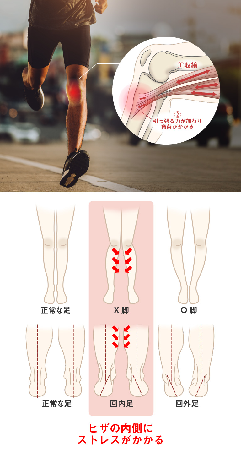 またX脚や過度な回内足(足部が内側に落ち込んでいる)のアライメントがある場合は、動作に伴い、ヒザの内側にストレスがかかりやすくなるため、鵞足炎が起こりやすくなります。